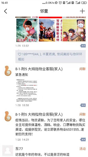 疫情面前,每天大家通过邻里圈、邻聊沟通生活、工作、防疫措施,业主们真正体会到了守护在自己家园的物业人的付出与真诚。当看到软件邻里圈中,物业员工发出物资短缺的求援后,自行组织将自己的防护物资提供到物业人手中,助力疫情防控工作。一张口罩、一把体温枪、一瓶消毒水就是物业抵御病毒的全部武器。4号楼2单元1503的业主听闻后,给我们送来了100枚口罩,3号楼2单元703的业主送来消毒液、1号楼赵阿姨和4号楼的陈阿姨每天带着红袖标义务帮我们门岗执勤......物业人也被感动着,更有斗志投入到这场无声的硝烟中。邻里圈里到处是分享、是感动,是爱心、是互助......